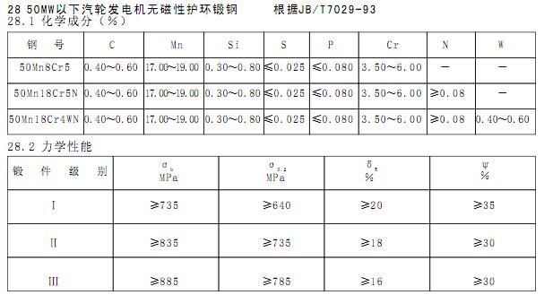 50Mn18Cr5标准:JB 1268-1993特性及适用范围:50Mn18Cr5是典型的和使用最普遍的锰铬系无磁性奥氏体护环钢。固溶处理后,进行半热变形强化或冷变形强化,以提高钢的强度,以满足不同护环类别的强度要求。用作汽轮发电机无磁性护环锻件及其他要求无磁性的零部件。50Mn18Cr5力学性能:抗拉强度 σb (MPa):I级,≥895条件屈服强度 σ0.2 (MPa):I级,≥760伸长率 δ5 (%):I级,≥25断面收缩率 ψ (%):I级,≥35